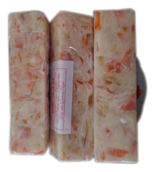 - Cán bột thành từng miếng mỏng, tỉa các cạnh rồi lần lượt xếp số mứt dẻo lên giữa mảng bột, nhẹ nhàng cuốn tròn mảng bột như cuốn chiếu, bó kín phần nhân. Bó với nilon, bó vuông, bó tròn tùy theo ý thích.
